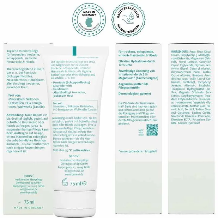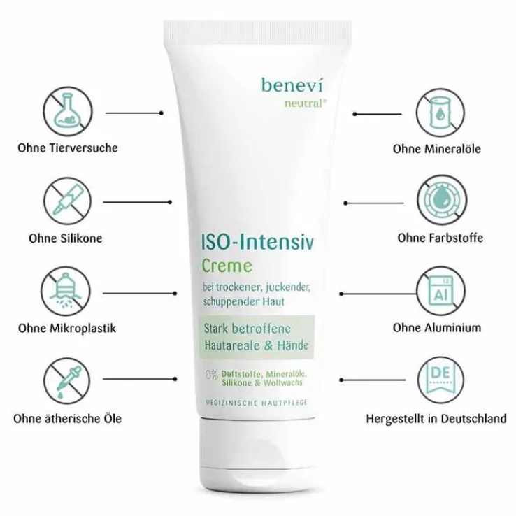 Benevi Neutral ISO-Intensivcreme ist eine Intensivpflege bei trockener, gereizter Haut – vielseitig einsetzbar bei Juckreiz & Schuppung – 10% Urea, 5% Magnesiumsalz.