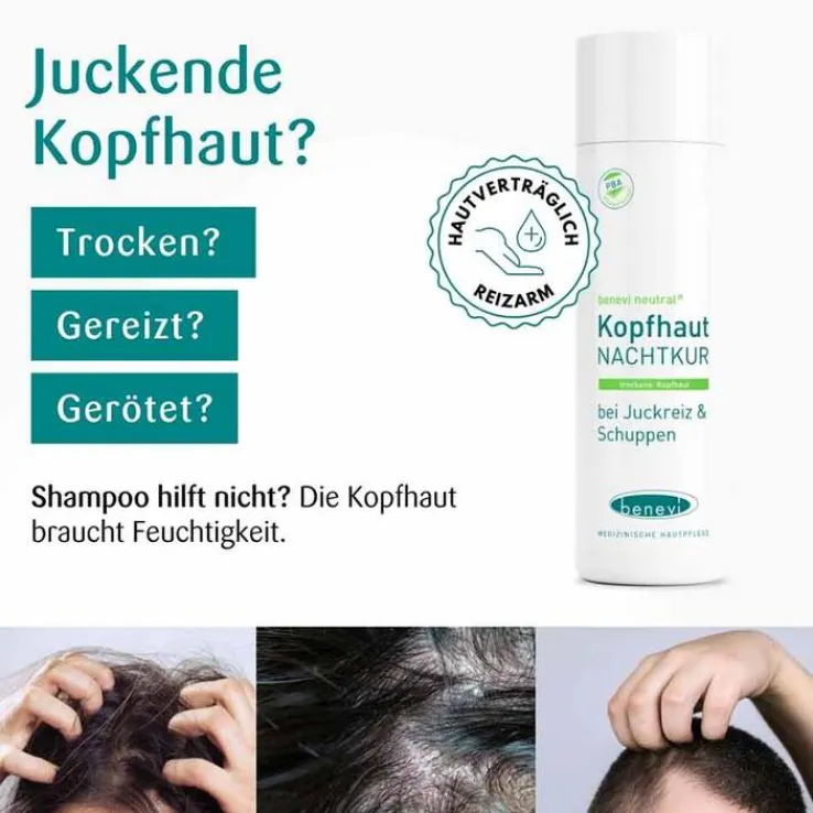 Trockene Kopfhaut zählt zu den häufigsten Ursachen für Juckreiz und weiße Schuppen. Die Benevi Neutral Kopfhaut-Nachtkur wurde speziell für die Anwendung über Nacht entwickelt: Sie spendet intensive Feuchtigkeit, beruhigt gereizte Hautpartien und hilft so, Juckreiz und Schuppenbildung zu mindern – ganz gezielt bei trockener und empfindlicher Kopfhaut.