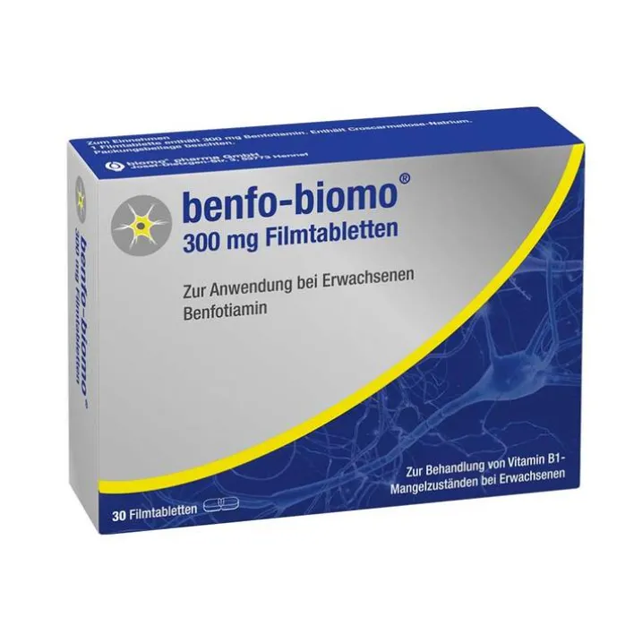 Benfo-biomo® 300 mg Filmtabletten. Anwendungsgebiete: Zur Behandlung von Vitamin-B1 -Mangelzuständen, falls dies durch eine angemessene Ernährung nicht behoben werden kann. Zu Risiken und Nebenwirkungen lesen Sie die Packungsbeilage und fragen Sie Ihre Ärztin, Ihren Arzt oder in Ihrer Apotheke. biomo pharma GmbH