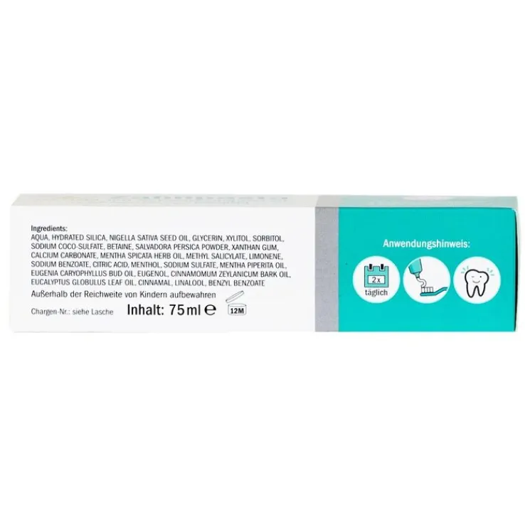 Wasser, Hydrated Silica, Nigella Sativa seed oil, Glycerin, Xylitol, Sorbitol, Sodium Coco-Sulfate, Betaine, Salvadora Persica powder, Xanthan gum, Calcium Carbonate, Mentha Spicata herb oil, Limonene, Sodium Benzoate, Citric Acid, Menthol, Sodium Sulfate, Mentha Piperita Oil, Eugenia Caryophyllus bud oil, Eugenol, Cinnamomum Zeylanicum bark oil, Eucalyptus Globulus Leaf Oil, Cinnamal, Linalool, Benzyl Benzoate