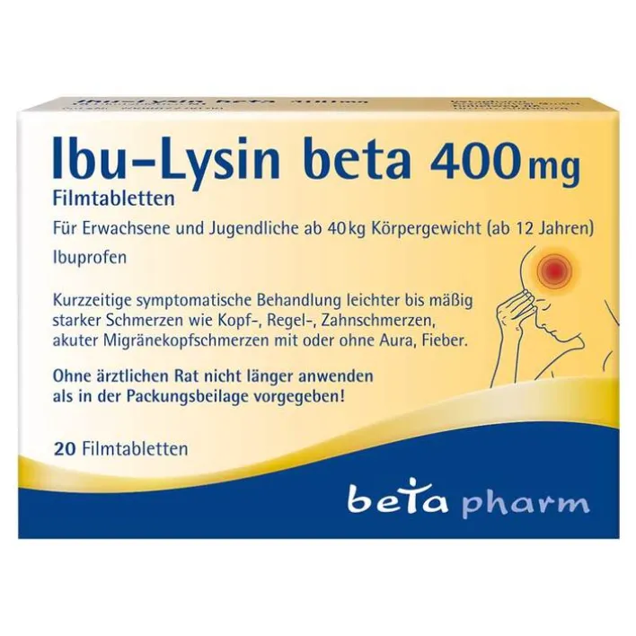 Ibu-Lysin beta 400 mg Filmtabletten. Wirkstoff: Ibuprofen. Anw.: Bei Erwachsenen und Jugendlichen ab 40 kg Körpergewicht (ab 12 Jahren): Kurzzeitige symptomatische Behandlung von leichten bis mäßig starken Schmerzen wie Kopfschmerzen, Regelschmerzen, Zahnschmerzen, akuten Migränekopfschmerzen mit oder ohne Aura, Fieber. Warnh.: Ohne ärztlichen Rat nicht länger anwenden als in der Packungsbeilage vorgegeben! Zu Risiken und Nebenwirkungen lesen Sie die Packungsbeilage und fragen Sie Ihre Ärztin, Ihren Arzt oder in Ihrer Apotheke. betapharm Arzneimittel GmbH, 86156 Augsburg www.betapharm.de