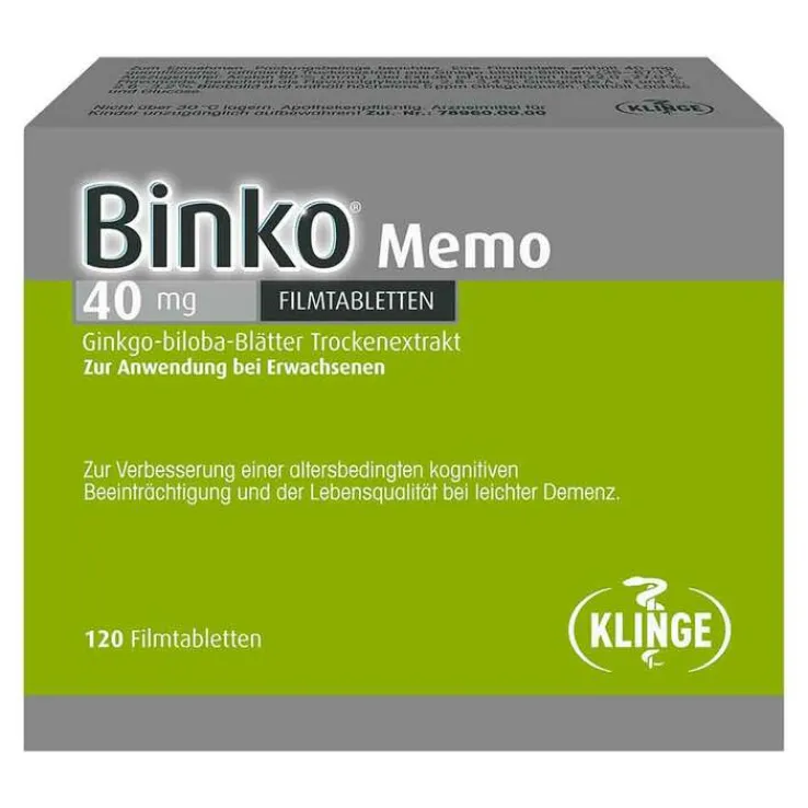 Binko® Memo 40 mg Filmtabletten: Wirkstoff: Ginko-biloba-Blätter-Trockenextrakt. Anwendungsgebiet: Pflanzl. Arzneimittel zur Verbesserung einer altersbedingten kognitiven Beeinträchtigung u. der Lebensqualität bei leichter Demenz. Warnhinweise: Enthält Lactose, Glucose u. Natrium. Arzneimittel f. Kinder unzugängl. aufbewahren. Stand: 06/20-2. Zu Risiken und Nebenwirkungen lesen Sie die Packungsbeilage und fragen Sie Ihre Ärztin, Ihren Arzt oder in Ihrer Apotheke. Klinge Pharma GmbH, 83607 Holzkirchen, Deutschland