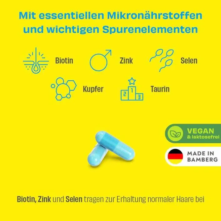 * Biotin , Selen und Zink tragen zur Erhaltung normaler Haare bei. Zink trägt zur Erhaltung eines normalen Testosteronspiegels im Blut bei. Zink, Selen und Kupfer tragen dazu bei, die Zellen vor oxidativem Stress zu schützen. Zink hat eine Funktion bei der Zellteilung. Kupfer trägt zu einer normalen Haarpigmentierung bei. Selen trägt zu einer normalen Spermabildung bei.