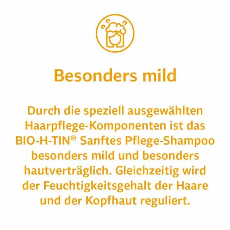Die enthaltenen Haarpflegekomponenten machen es besonders mild und hautverträglich. Das BIO-H-TIN Pflegeshampoo reguliert sowohl den Feuchtigkeitsgehalt des Haares, als auch der Kopfhaut. Durch den Zusatz eines Rückfetters ist es ideal für das tägliche Haarewaschen. Das BIO-H-TIN Pflege-Shampoo ist auch für Personen mit empfindlicher Kopfhaut geeignet. Ihr Haar erhält einen gesunden Glanz, die Kämmbarkeit wird verbessert und es wird weich im Griff.