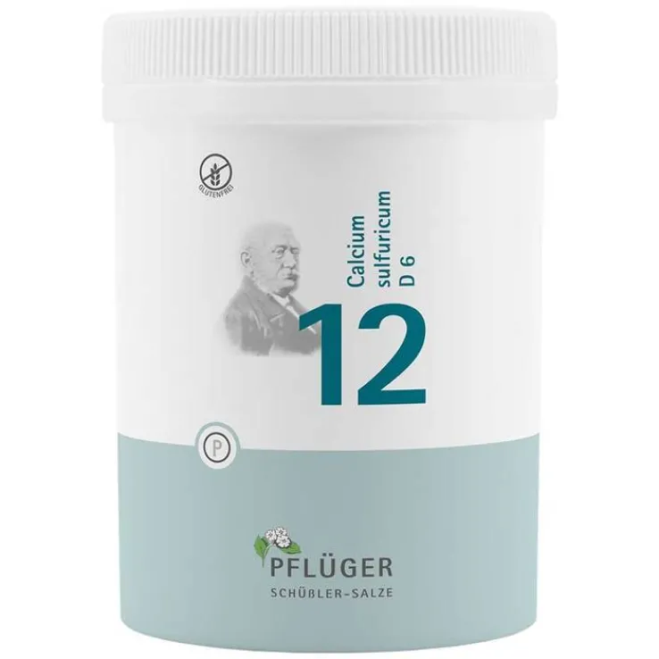 Biochemie Pflüger® Nr. 12 Calcium sulfuricum D 6, Zusammensetzung: 1 Tablette enthält: Wirkstoff: Calcium sulfuricum D 6 Trit. 250 mg. Sonstige Bestandteile: Calciumbehenat (DAB), Kartoffelstärke. Registriertes homöopathisches Arzneimittel, daher ohne Angabe einer therapeutischen Indikation. Gegenanzeigen/Nebenwirkungen: keine bekannt. Enthält Lactose. Packungsbeilage beachten. Zu Risiken und Nebenwirkungen lesen Sie die Packungsbeilage und fragen Sie Ihre Ärztin, Ihren Arzt oder in Ihrer Apotheke. Homöopathisches Laboratorium Alexander Pflüger GmbH & Co. KG, 33378 Rheda-Wiedenbrück | [email protected] | www.pflueger.de