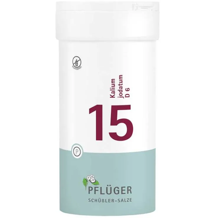Biochemie Pflüger® Nr. 15 Kalium jodatum D 6, Zusammensetzung: 1 Tablette enthält: Wirkstoff: Kalium jodatum Trit. D12 250 mg. Sonstige Bestandteile: Calciumbehenat (DAB), Kartoffelstärke. Registriertes homöopathisches Arzneimittel, daher ohne Angabe einer therapeutischen Indikation. Gegenanzeigen/Nebenwirkungen: keine bekannt. Enthält Lactose. Packungsbeilage beachten. Zu Risiken und Nebenwirkungen lesen Sie die Packungsbeilage und fragen Sie Ihre Ärztin, Ihren Arzt oder in Ihrer Apotheke. Homöopathisches Laboratorium Alexander Pflüger GmbH & Co. KG, 33378 Rheda-Wiedenbrück | [email protected] | www.pflueger.de