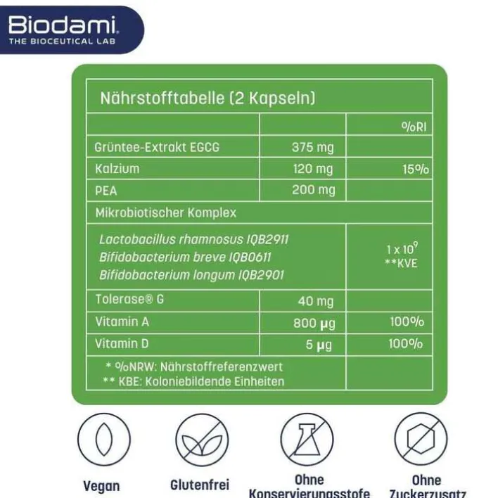 - Nahrungsergänzungsmittel mit Grüntee-Extrakt, Kalzium, PEA, Tolerase G, Vitamin A, Vitamin D und mikrobiotischem Komplex