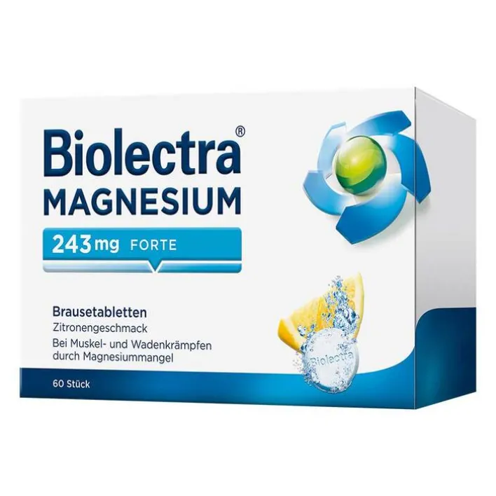 Biolectra® MAGNESIUM 243 mg forte Brausetabletten Zitronengeschmack Anwendungsgebiete: Nachgewiesener Magnesiummangel, wenn er Ursache für Störungen der Muskeltätigkeit (neuromuskuläre Störungen, Wadenkrämpfe) ist. Hinweise: Enthält Natrium, Kalium und Sorbitol. Zu Risiken und Nebenwirkungen lesen Sie die Packungsbeilage und fragen Sie Ihre Ärztin, Ihren Arzt oder in Ihrer Apotheke. Stand 12/2023