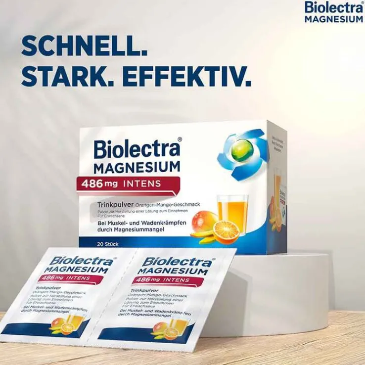 Biolectra® MAGNESIUM 486 mg INTENS Trinkpulver Orangen-Mango-Geschmack steht für eine schnelle und anwenderfreundliche Intensiv-Therapie. Das apothekenpflichtige Arzneimittel zur Behandlung von Muskel- und Wadenkrämpfen durch Magnesium-Mangel ist ein hochdosiertes Magnesium-Trinkpulver und sorgt mit seiner hohen Dosierung für eine schnelle Verbesserung der Magnesiumversorgung. Zudem bietet es eine gute Löslichkeit durch reines Magnesium-Citrat und punktet mit einfacher Einnahme und fruchtigem Orangen-Mango-Geschmack.