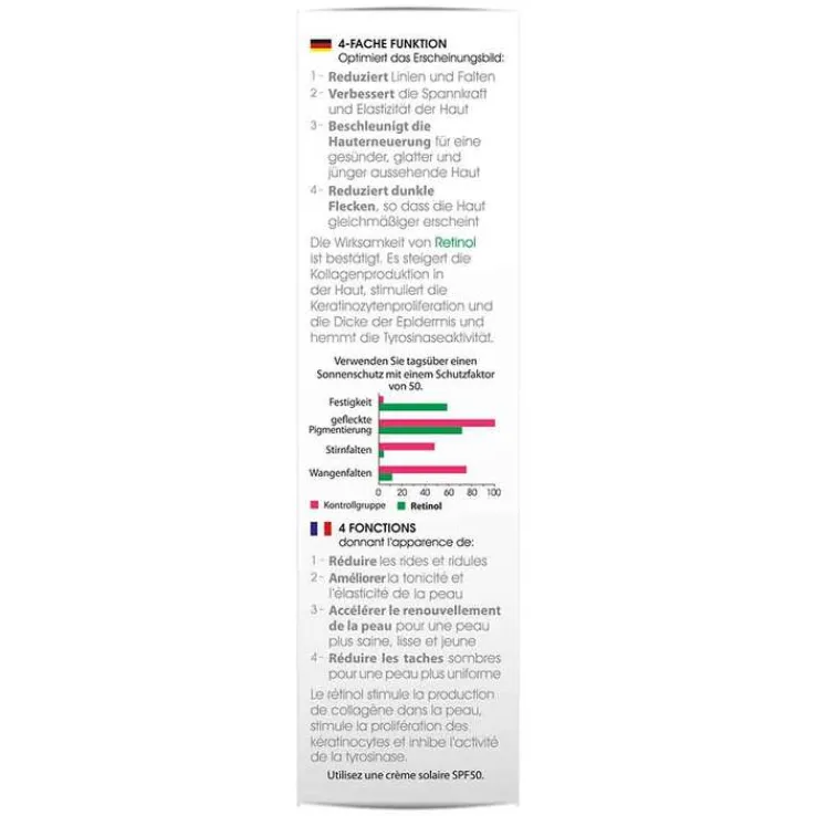 Retinol steigert die Kollagenproduktion in der Haut, stimuliert die Keratinozytenproliferation*, die Dicke der Epidermis und hemmt die Tyrosinaseaktivität.**