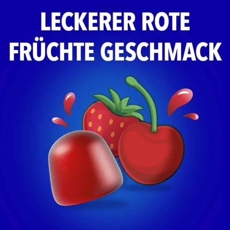 Glukosesirup; Zucker; Wasser; Vitamin C (L-Ascorbinsäure, Natrium-L-ascorbat); Geliermittel: Pektin; Niacin (Nicotinamid); Säureregulatoren: Natriumascorbat, Trinatriumcitrat; färbendes Lebensmittel (Konzentrat aus schwarzer Karotte); Zinkcitrat; Bakterienstamm Bacillus coagulans SNZ 1969; Maltodextrin; Natürliches Rote Früchte Aroma mit anderen natürlichen Aromen; Stabilisator: Citronensäure; Überzugsmittel: Carnaubawachs.