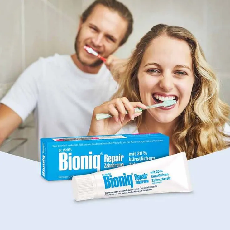 Die Bioniq Repair-Zahncreme basiert auf der Idee der Bionik/Biomimetik. Sie enthält Hydroxylapatit – eine Substanz, die dem menschlichen Zahnschmelz nachempfunden ist. Dieser Inhaltsstoff hilft, den Zahnschmelzabtrag zu minimieren und sowohl Zähne als auch Zahnfleisch langfristig gesund zu halten.