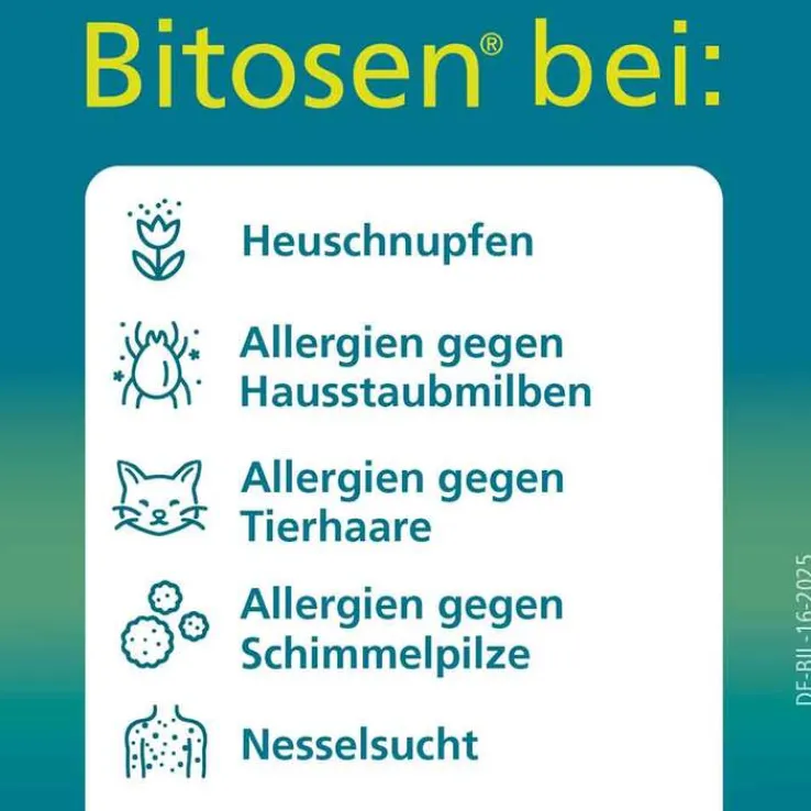 Bitosen® 20 mg Tabletten, Bitosen® 20 mg Schmelztabletten. Wirkstoff: Bilastin. Anwendungsgebiete: Für Erwachsene und Jugendliche ab 12 Jahren zur Linderung der Beschwerden von Heuschnupfen, anderer Formen allergischer Rhinitis sowie juckenden Hautausschlägen. Warnhinweis: Bitosen® 20 mg Schmelztabletten: Enthält Ethanol. Packungsbeilage beachten. Zu Risiken und Nebenwirkungen lesen Sie die Packungsbeilage und fragen Sie Ihre Ärztin, Ihren Arzt oder in Ihrer Apotheke. Pharmazeutischer Unternehmer: Menarini International Operations Luxembourg S.A., Mitvertrieb durch BERLIN-CHEMIE AG, 12489 Berlin.