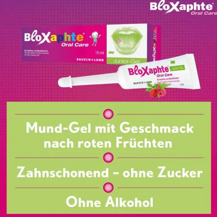 Das BloXaphte® Oral Care Junior-Gel eignet sich zur gezielten Behandlung von Aphthen und bei entzündlichen Verletzungen der Schleimhaut. Dank seiner speziellen Formulierung sorgt Bloxaphte® Oral Care Junior-Gel durch einen Barriereeffekt für eine schnelle, wirksame Linderung des lokalen Schmerzes und fördert die Abheilung von Aphthen und Mundläsionen. Natürliches Aroma roter Früchte verleiht dem Gel seinen für Kinder angenehmen Geschmack.