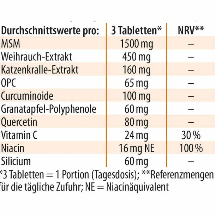 Methylsulfonylmethan (MSM) (48 %), Weihrauch-Extrakt (13 %), Katzenkralle-Extrakt (5 %), Traubenkern-Extrakt (5 %), Kurkuma-Extrakt (5 %), Granatapfelsaft-Extrakt (5 %; fermentiert, gefriergetrocknet), Füllstoff Cellulose, Kieselerde, Acerolakirsch-Extrakt (4 %), Trennmittel Magnesiumsalze von Speisefettsäuren (pflanzlich), Quercetin (3 %), Nicotinamid. Kann Spuren von Schalenfrüchten enthalten.
