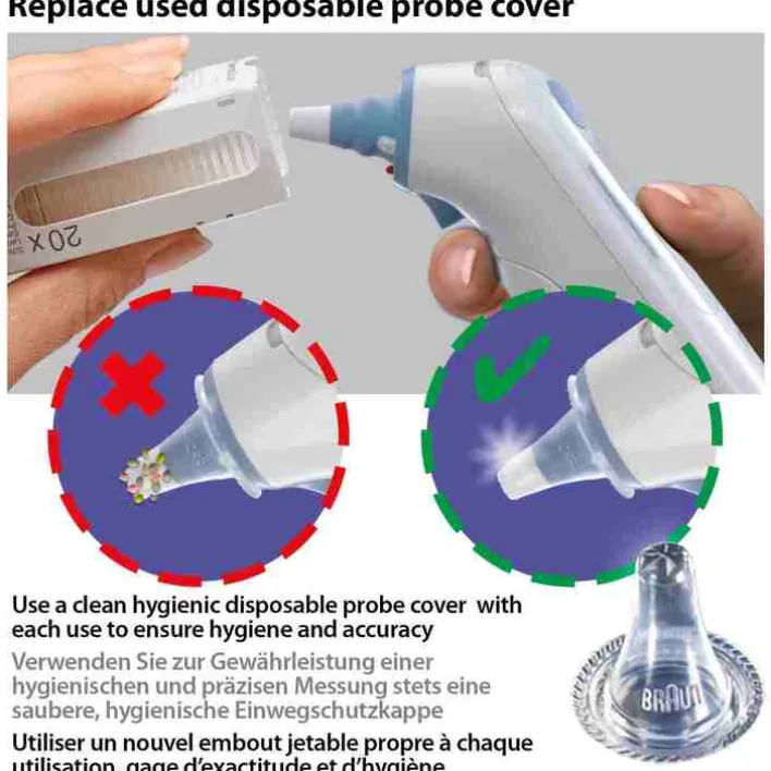 Es ist wichtig, dass die Braun ThermoScan®-Schutzkappen auf dem Temperatursensor nach jeder Benutzung ausgewechselt werden. Einweg-Schutzkappen sorgen für eine hygienische Verwendung ohne Reinigung oder Desinfizierung des Sensors und verhindern damit Kreuzkontaminationen.