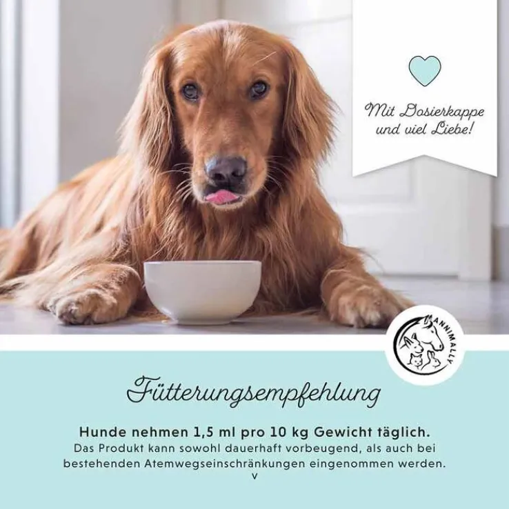 Annimally Bronchial Plus ist ein flüssiges Ergänzungsfuttermittel für Hunde und kein Medikament oder Arzneimittel. Es handelt sich nicht um einen medizinischen Hustenstiller oder Hustensaft.