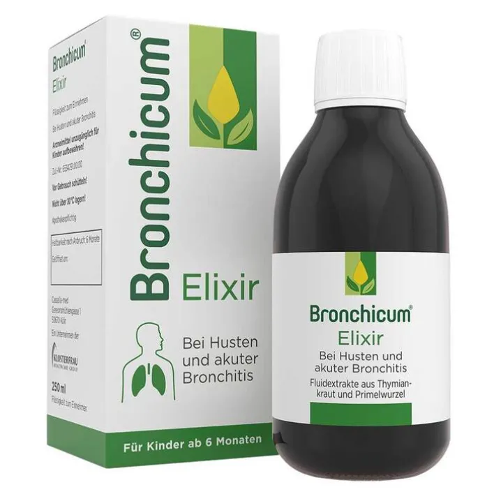 Bronchicum® Elixir. Anwendungsgebiete: Behandlung der Symptome einer akuten Bronchitis und Erkältungskrankheiten der Atemwege mit zähflüssigem Schleim. Warnhinweise: Enthält 4,9 Vol.-% Alkohol. Enthält Sucrose (Zucker) und Invertzucker. Packungsbeilage beachten. Zu Risiken und Nebenwirkungen lesen Sie die Packungsbeilage und fragen Sie Ihre Ärztin, Ihren Arzt oder in Ihrer Apotheke.