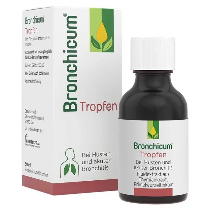 Bronchicum® Tropfen. Anwendungsgebiete: Behandlung der Symptome einer akuten Bronchitis und Erkältungskrankheiten der Atemwege mit zähflüssigem Schleim. Warnhinweise: Enthält 27,7 Vol.-% Alkohol, Sucrose (Zucker), Invertzucker, Eukalyptusöl, Levomenthol. Packungsbeilage beachten. Zu Risiken und Nebenwirkungen lesen Sie die Packungsbeilage und fragen Sie Ihre Ärztin, Ihren Arzt oder in Ihrer Apotheke.