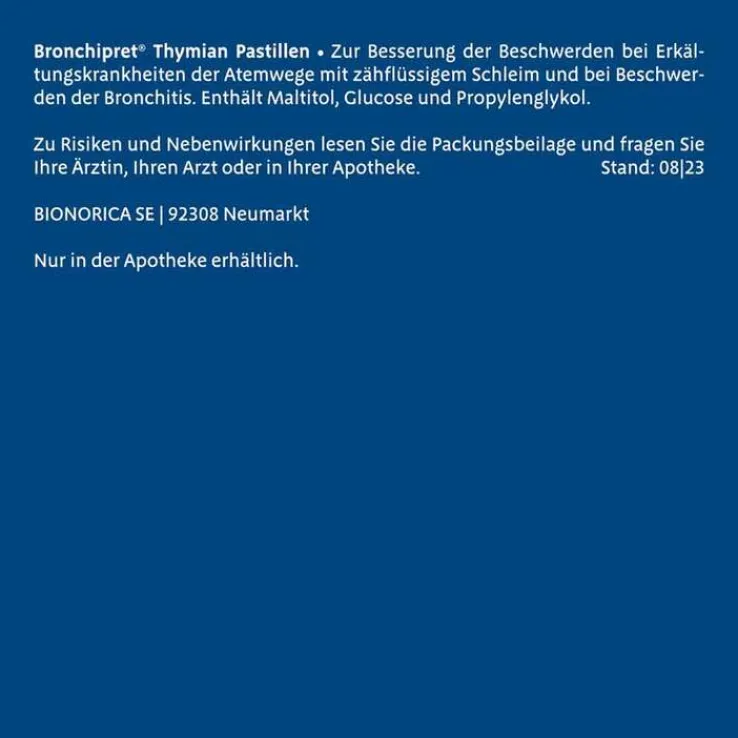 Bronchipret®Thymian Pastillen. Zur Besserung der Beschwerden bei Erkältungskrankheiten der Atemwege mit zähflüssigem Schleim und bei Beschwerden der Bronchitis. Enthält Maltitol, Glucose und Propylenglykol. Zu Risiken und Nebenwirkungen lesen Sie die Packungsbeilage und fragen Sie Ihre Ärztin, Ihren Arzt oder in Ihrer Apotheke. BIONORICA SE | 92308 Neumarkt Nur in der Apotheke erhältlich. Stand: 08|23