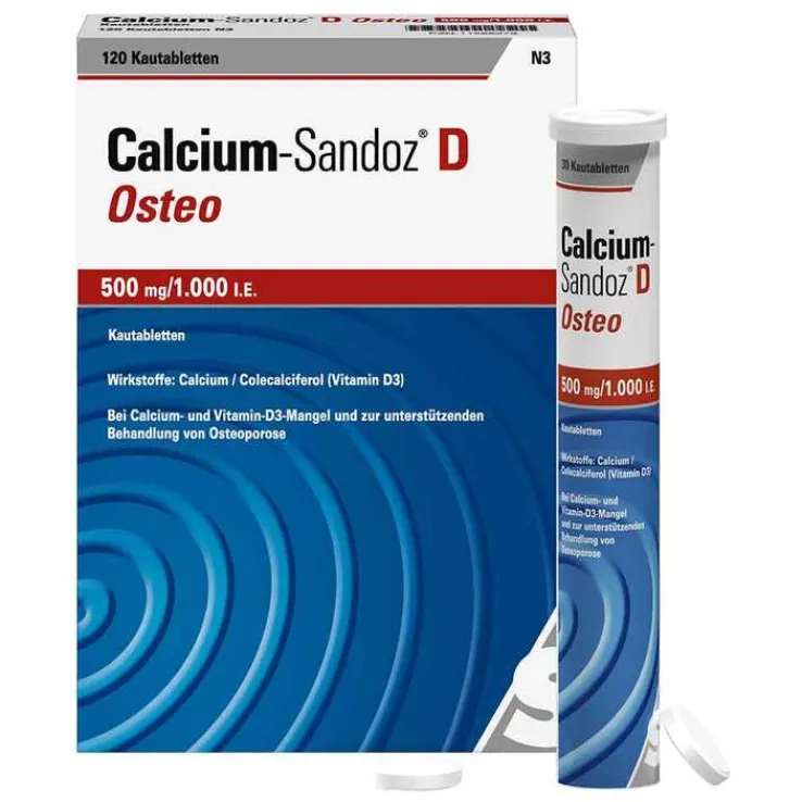 Calcium-Sandoz® D Osteo 500 mg/1000 I.E. Kautabletten, Wirkstoffe: Calcium/Colecalciferol (Vitamin D3). Anwendungsgebiete: Zur Prophylaxe und Behandlung von Calcium- und Vitamin-D-Mangelzuständen bei älteren Menschen; als Calcium- und Vitamin-D-Ergänzung zur unterstützenden Behandlung der Osteoporose (Knochenschwund). Warnhinweis: Enthält Aspartam, Sorbitol, Isomalt und Sucrose (Zucker). Zu Risiken und Nebenwirkungen lesen Sie die Packungsbeilage und fragen Sie Ihre Ärztin, Ihren Arzt oder in Ihrer Apotheke! Mat.-Nr.: 2/51013646-02 Stand: März 2020 Hexal AG, 83607 Holzkirchen, www.hexal.de