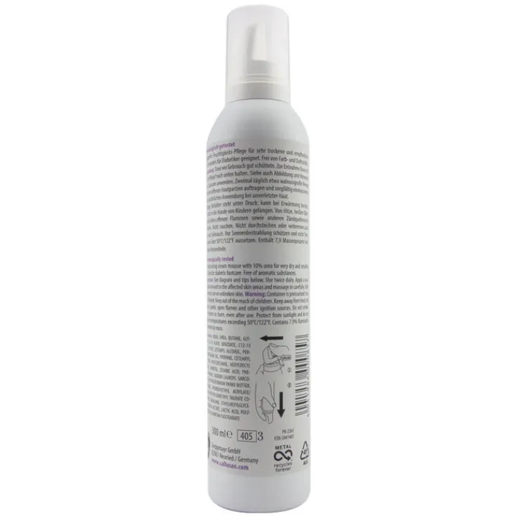 Callusan Extra Schaum ist mit 10% Urea. Der Schaum reguliert den Feuchtigkeitsausgleich auch in tieferen Hautschichten. Die enthaltene Stearinsäure schützt zusätzlich vor Umwelteinflüssen und sorgt für eine ausgewogene Rückfettung. In ihren natürlichen Reserven wird die Haut nachhaltig versorgt und ergänzt. Callusan Extra Schaum ist frei von Duft- und Farbstoffen und für Diabetiker besonders geeignet.
