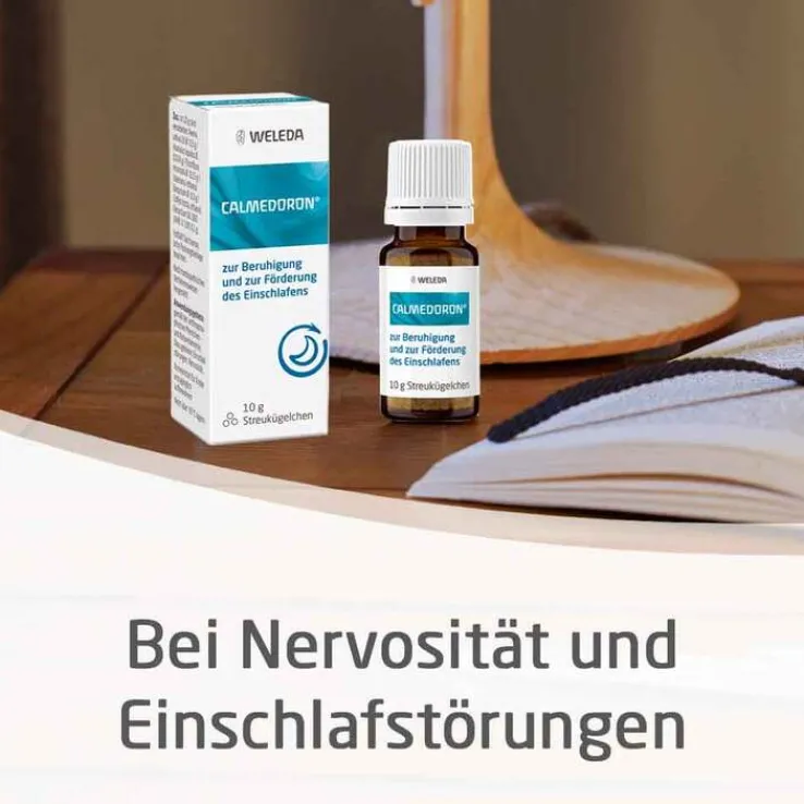 Calmedoron® Streukügelchen Warnhinweis: Enthält Sucrose (Zucker), bitte Packungsbeilage beachten. Gemäß der anthroposophischen Menschen- und Naturerkenntnis. Dazu gehören: Einschlafstörungen und Nervosität. Dosierung und Art der Anwendung Falls vom Arzt nicht anders verordnet, erhalten Erwachsene und Kinder ab 6 Jahren als Einzeldosis 15 Streuku¨gelchen, Kleinkinder von 1–5 Jahren 10 Streuku¨gelchen, Säuglinge im 1. Lebensjahr 5 Streuku¨gelchen. Bei Einschlafstörungen wird die Einzeldosis abends vor dem Schlafengehen eingenommen, bei Nervosität wird die entsprechende Menge Streuku¨gelchen 1-mal täglich eingenommen. Zu Risiken und Nebenwirkungen lesen Sie die Packungsbeilage und fragen Sie Ihre Ärztin, Ihren Arzt oder in Ihrer Apotheke. Weleda AG, Schwäbisch Gmünd