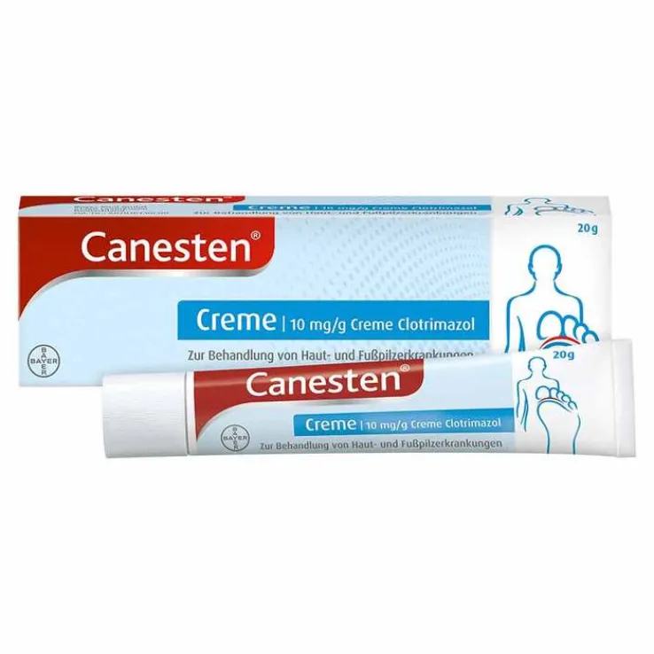 Canesten® Creme Wirkstoff: Clotrimazol Anwendungsgebiete: Zur Behandlung von Pilzerkrankungen (Mykosen) der Haut und Schleimhaut, verursacht durch Dermatophyten, Hefen, Schimmelpilze und andere, wie Malassezia furfur, sowie Hautinfektionen durch Corynebacterium minutissimum. Anwendung auch bei Candida-Vulvitis und Candida-Balanitis. Hinweis: Enthält Benzylalkohol und Cetylstearylalkohol. Packungsbeilage beachten! Zu Risiken und Nebenwirkungen lesen Sie die Packungsbeilage und fragen Sie Ihre Ärztin, Ihren Arzt oder in Ihrer Apotheke. Bayer Vital GmbH, 51368 Leverkusen, Deutschland Stand: 08/2023