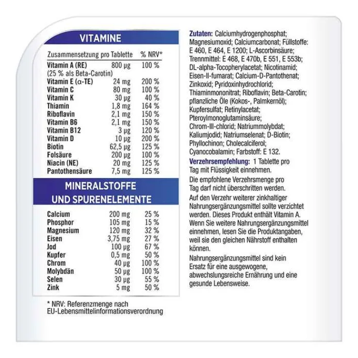 Calciumhydrogenphosphat; Magnesiumoxid; Calciumcarbonat; Füllstoffe: E 460, E 464, E 1200; L-Ascorbinsäure; Trennmittel: E 468, E 470b, E 551, E 553b; DL-alpha-Tocopherylacetat; Nicotinamid; Eisen-II-fumarat; Calcium-D-Pantothenat; Zinkoxid; Pyridoxinhydrochlorid; Thiaminmononitrat; Riboflavin; Beta-Carotin; pflanzliche Öle (Kokos-, Palmkernöl); Kupfersulfat; Retinylacetat; Pteroylmonoglutaminsäure; Chrom-III-chlorid; Natriummolybdat; Kaliumjodid; Natriumselenat; D-Biotin; Phyllochinon; Cholecalciferol; Cyanocobalamin; Farbstoff: E 132.