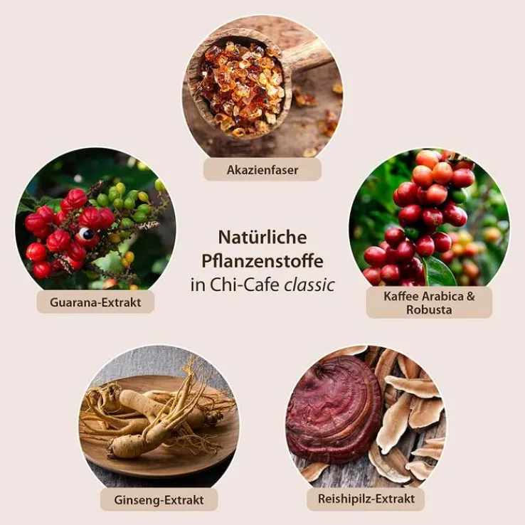 Chi-Cafe classic ist mehr als nur ein Kaffee. Mit seiner feinen Komposition weckt er sanft das Chi, die Lebensenergie*, und beflügelt Geist und Gemüt. Als erstes ballaststoffreiches Kaffeegetränk mit aromatisierenden Pflanzenextrakten sorgt er bereits seit 20 Jahren für puren Genuss. In jeder Tasse vereinen sich die edlen Noten der erlesenen Kaffeesorten Arabica und Robusta. Die Akazienfaser in Chi-Cafe classic liefert nicht nur wertvolle lösliche Ballaststoffe, sondern verleiht ihm auch ein geschmeidiges Mundgefühl. Ausgewählte Pflanzenextrakte aus Ginseng, Guarana und dem Reishi-Pilz sorgen für eine besondere aromatische Tiefe. Gönnen Sie sich einen Moment der Ruhe und lassen Sie sich von diesem einzigartigen Kaffee verwöhnen.