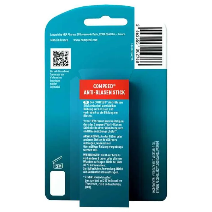 Der Compeed® Anti-Blasen Stick hilft unsichtbar, Reibung und Wundscheuern vorzubeugen. Somit ist der Compeed® Anti-Blasen Stick effektiv in der Vorbeugung von Blasen. Er verhindert die Blasenbildung bei 9 von 10 Konsumenten*. Der Stick ist nicht nur für wunde Stellen an den Füßen geeignet. Der pflegende Fettfilm kann auch an anderen Stellen des Körpers aufgetragen werden, wann immer stärkerer Reibung auftreten. Da die Fettschicht des Sticks auf Pflanzenöl basiert, wird die Haut gleichzeitig gepflegt und somit geschmeidig gehalten.