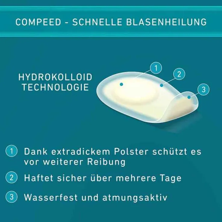 Compeed Blasenpflaster bestehen aus Hydrokolloiden, die die Wunde feucht halten und Schorfbildung verhindern. (Prinzip der feuchten Wundheilung)