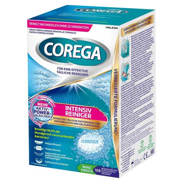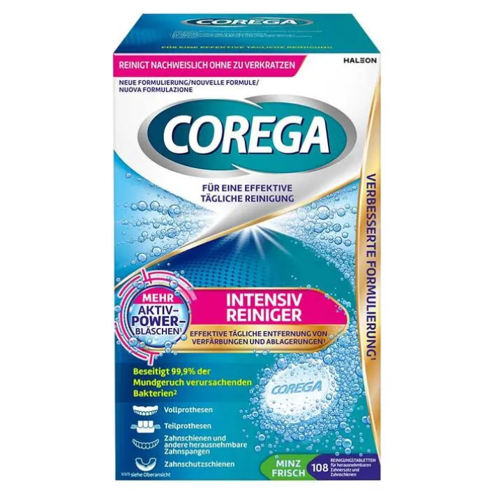 Die Corega Intensiv Reiniger Tabs mit verbesserter Formulierung** eignen sich zur täglichen Reinigung für Voll- und Teilprothesen, Retainer und Aligner, Zahnschutzschienen und andere herausnehmbare Zahnspangen. Mit mehr Aktiv-Power-Bläschen**, die stark bei der Reinigung, aber sanft zum Zahnersatz und zu Zahnschienen sind.