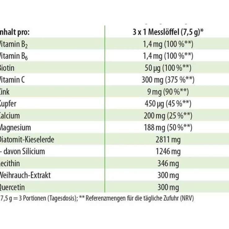 - Mikronisierte Diatomit-Kieselerde, Weihrauch-Extrakt, Quercetin & Lecithin