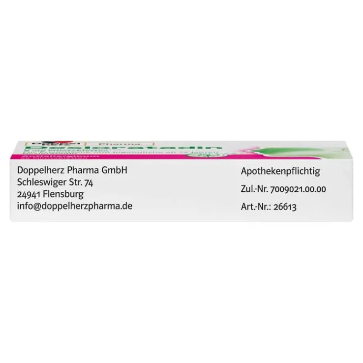 Desloratadin DoppelherzPharma 5 mg Filmtabletten..Wirkstoff: Desloratadin. Zusammensetz.: Jede Filmtablette enthält 5 mg Desloratadin. Anwendungsgebiete: Zur Besserung der Symptome bei allergischer Rhinitis (durch eine Allergie hervorgerufene Entzündung der Nasengänge, beispielsweise Heuschnupfen oder Hausstaubmilben- Allergie) bei Erw. und Jugendl. ab 12 Jahren. Diese Symptome beinhalten Niesen, laufende oder juckende Nase, Juckreiz am Gaumen und juckende, gerötete oder tränende Augen. Ebenfalls zur Besserung der Symptome bei Urtikaria (ein durch eine Allergie hervorgerufener Hautzustand). Diese Symptome beinhalten Juckreiz und Quaddeln. Zu Risiken und Nebenwirkungen lesen Sie die Packungsbeilage und fragen Sie Ihre Ärztin, Ihren Arzt oder in Ihrer Apotheke. Stand 09/2024