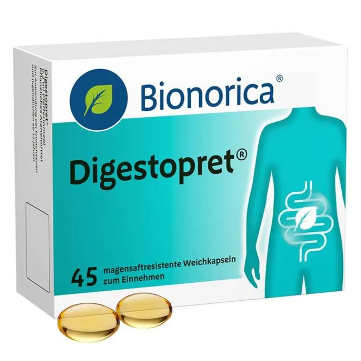 Das pflanzliche Arzneimittel Digestopret® lindert Symptome des Reizdarmsyndroms. Es enthält hochdosiertes Pfefferminzöl, das Blähungen löst, die Darmmuskulatur entspannt und die Verdauung unterstützen kann.