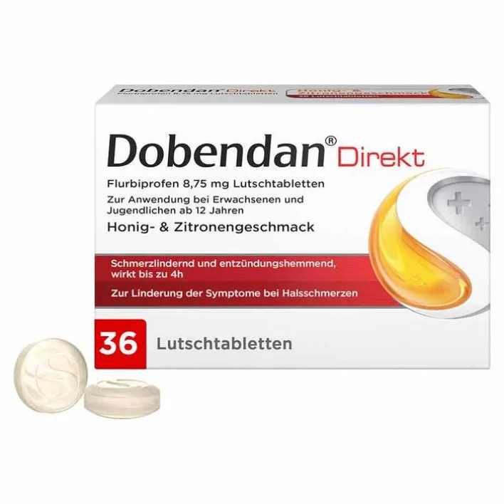Dobendan® Direkt ist ein schmerzstillendes und entzündungshemmendes Arzneimittel in der Darreichungsform lutschbarer Halstabletten mit Honig-Zitronen-Geschmack. Dank des Wirkstoffs Flurbiprofen sorgen die Lutschtabletten für eine bis zu 4 Stunden anhaltende Linderung von Halsschmerzen. Diese sind häufig Symptome einer Entzündung im Bereich der Rachenschleimhaut. Ist das Rachengewebe entzündet, etwa während einer Erkältung, können zusätzlich Rötungen und Schwellungen auftreten, welche zu Schluckbeschwerden führen können.
