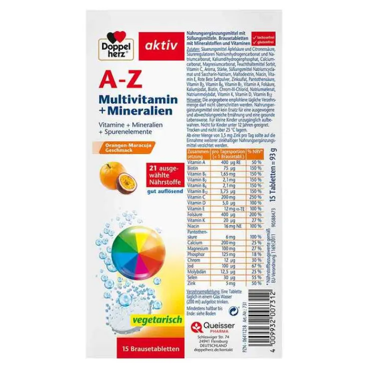 Doppelherz aktiv A-Z Multivitamin + Mineralien Brausetabletten enthalten sorgfältig aufeinander abgestimmte Vitamine, Mineralstoffe und Spurenelemente. Diese Nährstoffe sind essentiell, d. h. unser Körper kann diese Stoffe nicht selbst bilden. Man muss sie regelmäßig und ausreichend über die Nahrung aufnehmen.