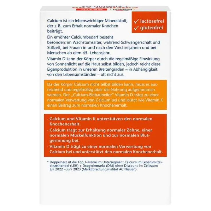 Die Calcium+D3 Tabletten von Doppelherz enthalten 700 mg Calcium in sinnvoller Kombination zusammen mit dem Calcium-Einbauhelfer Vitamin D und 80 µg Vitamin K. Calcium ist ein lebenswichtiger Mineralstoff und wird für den Erhalt normaler Knochen und Zähne benötigt.* Calcium trägt aber auch zur normalen Muskelfunktion und zur normalen Blutgerinnung bei.*