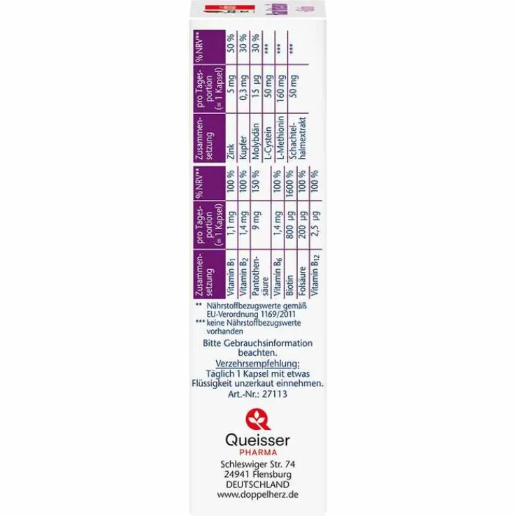 Füllstoff mikrokristalline Cellulose, L-Methionin, Gelatine (Rind), L-Cystein, Schachtelhalmextrakt, Pantothensäure, Zinkcarbonat, Maltodextrin, Trennmittel Magnesiumsalze der Speisefettsäuren, Trennmittel Siliciumdioxid, Vitamin B6, Vitamin B2, Vitamin B1, Farbstoffe Eisenoxide und Eisenhydroxide, Biotin, Kupfercarbonat, Folsäure, Natriummolybdat, Vitamin B12.