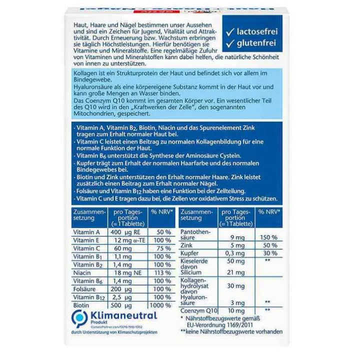 * Vitamin A, Vitamin B2, Biotin, Niacin und das Spurenelement Zink tragen zum Erhalt normaler Haut bei. Folsäure hat wie Vitamin B12 eine Funktion bei der Zellteilung. Vitamin C trägt zu einer normalen Kollagenbildung für eine normale Funktion der Haut bei. Vitamin B6 trägt zu einer normalen Cystein-Synthese bei. Kupfer trägt zu einer normalen Haarpigmentierung bei. Kupfer trägt zur Erhaltung von normalem Bindegewebe bei. Biotin und Zink tragen zur Erhaltung normaler Haut bei.Zink trägt zur Erhaltung normaler Nägel bei. Vitamin C und E tragen dazu bei, die Zellen vor oxidativem Stress zu schützen.