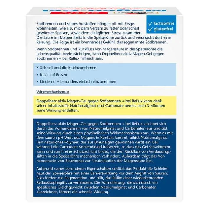 Doppelherz aktiv Magen-Gel gegen Sodbrennen + bei Reflux kann dank seiner Inhaltsstoffe Natriumalginat und Carbonate bereits nach 3 Minuten seine Wirkung entfalten.