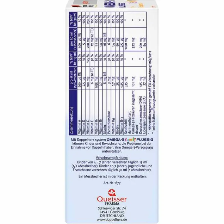 Das flüssige Nahrungsergänzungsmitttel von Doppelherz enthält neben den wichtigen Omega- 3-Fettsäuren noch die fettlöslichen Vitamine A, D, und E sowie die wasserlöslichen B-Vitamine und Vitamin C.