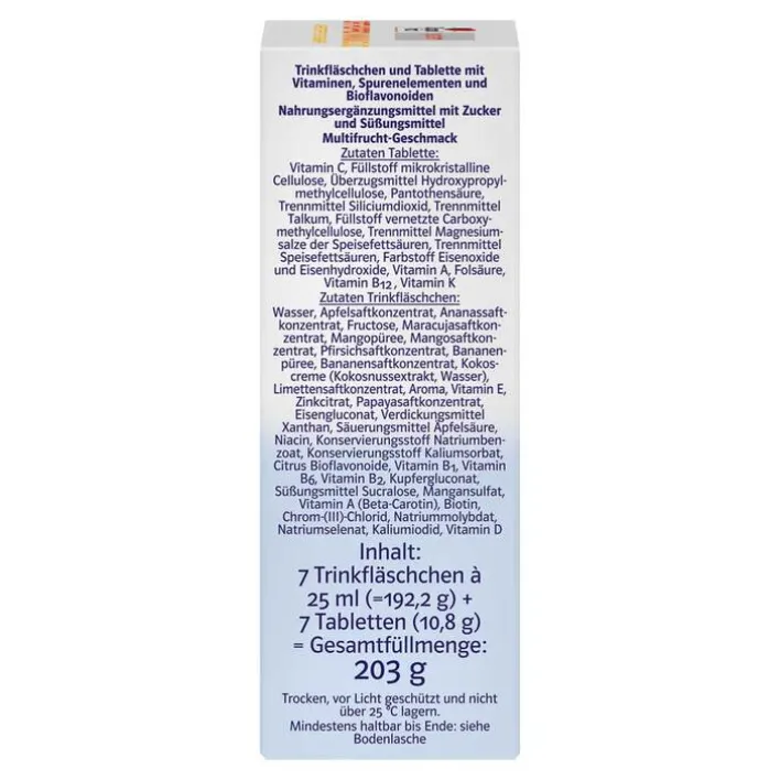 Trinkfläschchen: Wasser, Apfelsaftkonzentrat, Ananassaftkonzentrat, Fructose, Maracujasaftkonzentrat, Mangopüree, Mangosaftkonzentrat, Pfirsichsaftkonzentrat, Bananenpüree, Bananensaftkonzentrat, Kokoscreme (Kokosnussextrakt, Wasser), Limettensaftkonzentrat, Aroma, Vitamin E, Zinkcitrat, Papayasaftkonzentrat, Eisengluconat, Verdickungsmittel Xanthan, Säuerungsmittel Äpfelsäure, Niacin, Konservierungsstoff Natriumbenzoat, Konservierungsstoff Kaliumsorbat, Citrus Bioflavonoide, Vitamin B1, Vitamin B6, Vitamin B2, Kupfergluconat, Süßungsmittel Sucralose, Mangansulfat, Vitamin A (Beta-Carotin), Biotin, Chrom-(III)-Chlorid, Natriummolybdat, Natriumselenat, Kaliumiodid, Vitamin D