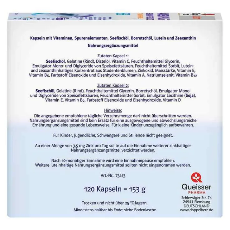 Kapsel 1:Seefischöl, Gelatine (Rind), pflanzliche Öle (Distel, Sonnenblumen), L-Ascorbinsäure, Feuchthaltemittel Glycerin, Emulgator Mono- und Diglyceride von Speisefettsäuren, Feuchthaltemittel Sorbit, lutein- und zeaxanthinhaltiges Konzentrat aus Studentenblumen, Emulgator Lecithine (Soja), Zinkoxid, Stärke, D-alpha-Tocopherol, Pyridoxinhydrochlorid, Farbstoff Eisenoxide und Eisenhydroxide, Retinylpalmitat, Natriumselenit, Cyanocobalamin