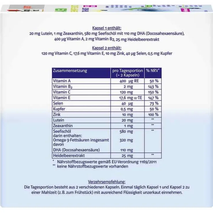 - Nahrungsergänzung mit Vitaminen, Spurenelementen, Seefischöl, Heidelbeerextrakt, Lutein und Zeaxanthin