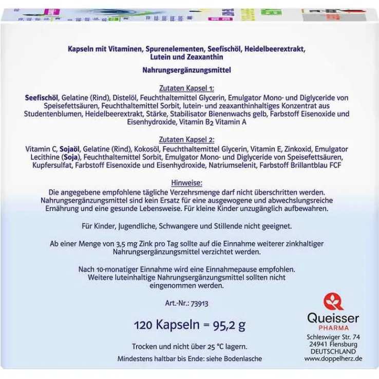 SEEFISCHÖL, Gelatine (Rind), Feuchthaltemittel Glycerin, Distelöl, Emulgator Mono- und Diglyceride von Speisefettsäuren, Feuchthaltemittel Sorbit, Heidelbeerextrakt, lutein- und zeaxanthinhaltiges Konzentrat aus Studentenblumen, Stabilisator Bienenwachs gelb, Emulgator Lecithine (SOJA), Maisstärke, Farbstoff Eisenoxide und Eisenhydroxide, Riboflavin, Retinylpalmitat.