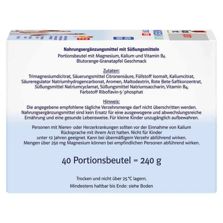 Trimagnesiumdicitrat, Säuerungsmittel Citronensäure, Füllstoff Isomalt, Kaliumcitrat, Säureregulator Natriumhydrogencarbonat, Aromen, Maltodextrin, Rote Bete-Saftkonzentrat, Süßungsmittel Natriumcyclamat, Süßungsmittel Natriumsaccharin, Vitamin B6, Farbstoff Riboflavin-5-phosphat.