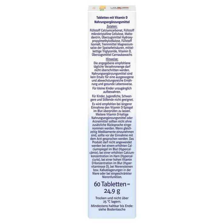 Es wird empfohlen bei längerer Einnahme den Vitamin D-Spiegel im Blut überprüfen zu lassen. Weitere Vitamin D-haltige Nahrungsergänzungsmittel der Arzneimittel sollten nicht ohne zusätzlicheRücksprache eingenommen werden. Wenn gleichzeitig Medikamente einzunehmen sind, sollte vor der Einnahme mit dem Arzt gesprochen werden. Das Produkt darf nicht angewendet werden bei einem erhöhten Cacliumspiegel im Blut (Hypercalcämie), bei einer erhöhten Cacliumkonzentration im Harn (Hypercalciurie), bei einer hohen Vitamin D-Konzentration im Blut (Hypervitaminose D), bei Nierenseinen bzw. Kalkablagerungen in der Niere oder bei eingeschränkter Nierenfunktion.
