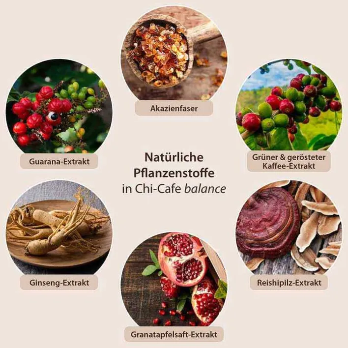 Chi-Cafe balance setzt sich aus erlesenen Zutaten zusammen, die Ihre Lebenskraft wecken. Lösliche Ballaststoffe aus der Akazienfaser, löslicher Kaffee, die organischen Mineralstoffe Calcium und Magnesium sowie Polyphenole aus Ginseng, Granatapfel, Guarana, Reishi-Pilz, grünem Kaffee und Kakao machen die besondere Zusammensetzung aus.